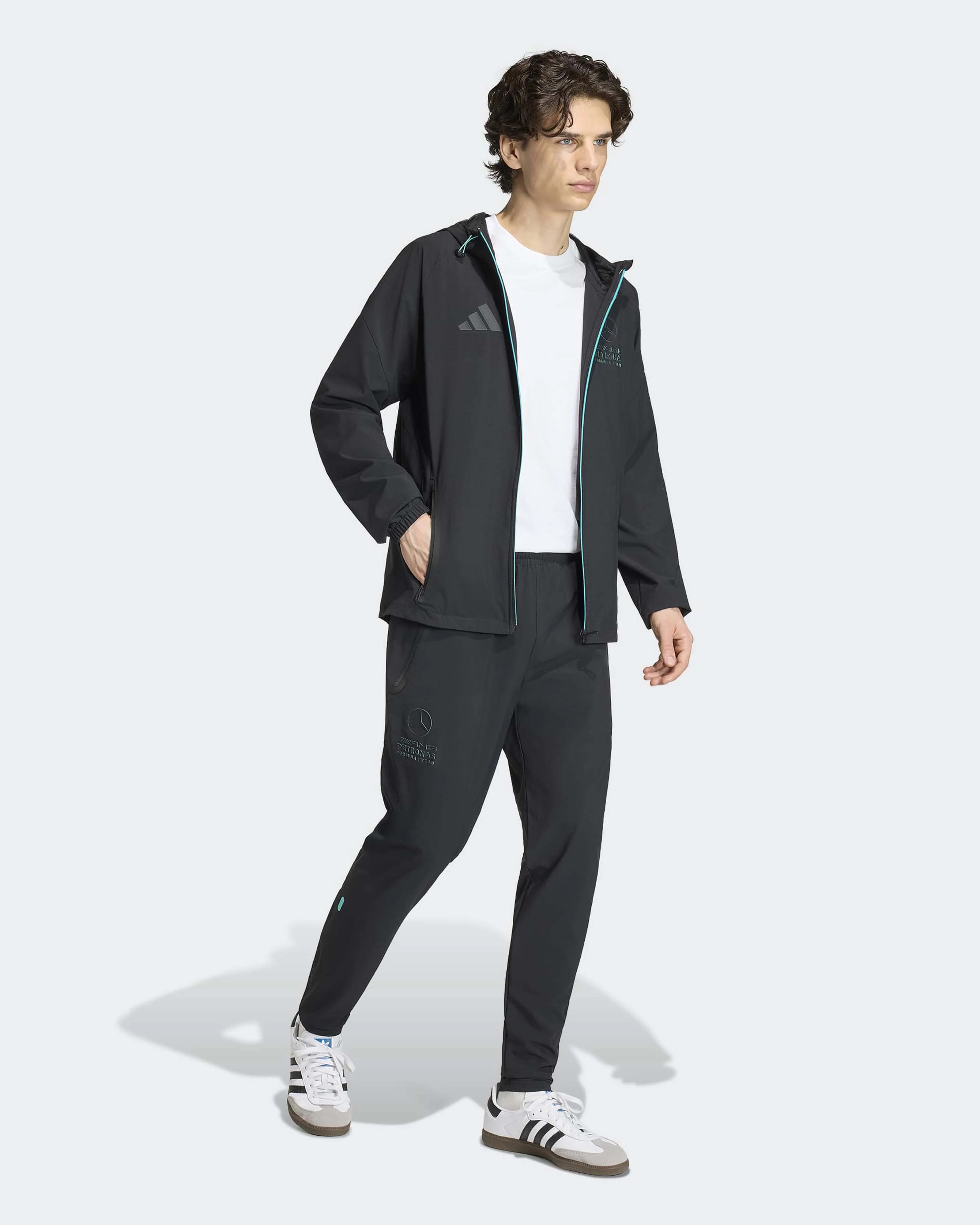 Bring race-day energy to your off-duty look with the Mercedes - AMG Petronas Formula One Team Lights Out Tracksuit Pants for men. In timeless black, these versatile track pants channel the spirit of lights out while delivering easy, everyday comfort.